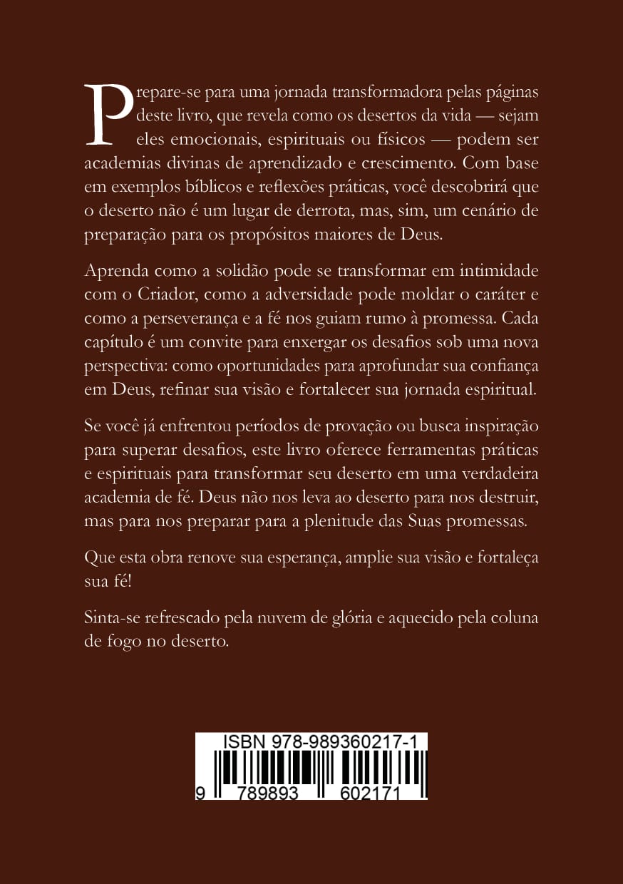 Autor: Taylor Filipe Sinopse: O Deserto Não é um Lugar de Permanência, Mas Sim uma Academia** Muitas vezes, enfrentamos momentos na vida em que tudo parece árido, solitário e sem direção. Esses períodos de desafios e provações podem nos fazer questionar o propósito do sofrimento e a aparente ausência de respostas de Deus. No entanto, **o deserto não é um lugar de permanência, mas sim uma academia**, onde somos moldados, fortalecidos e preparados para viver plenamente os planos que Deus tem para nós. Neste livro, exploramos como as dificuldades não são sinais de abandono, mas sim oportunidades de crescimento e transformação. Com base em princípios bíblicos e histórias reais, cada capítulo revela como a perseverança nas adversidades nos capacita a amadurecer na fé, desenvolver caráter e encontrar esperança mesmo nos momentos mais difíceis. Se você se sente perdido, sem forças para continuar ou sem entender os propósitos das suas lutas, esta obra irá guiá-lo a enxergar o deserto como um campo de treinamento divino, onde Deus ensina, molda e prepara aqueles que confiam n’Ele para uma nova e poderosa jornada.